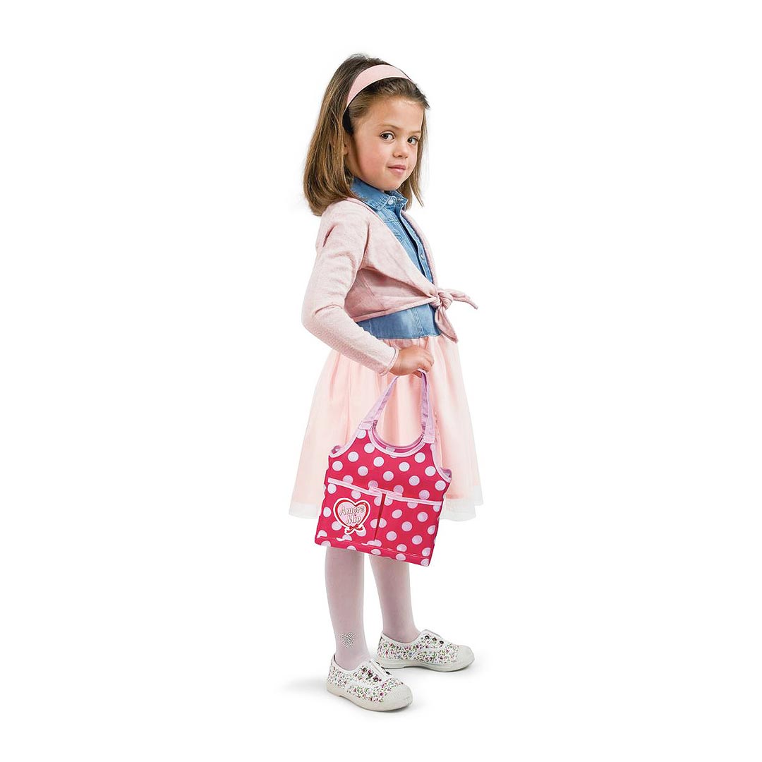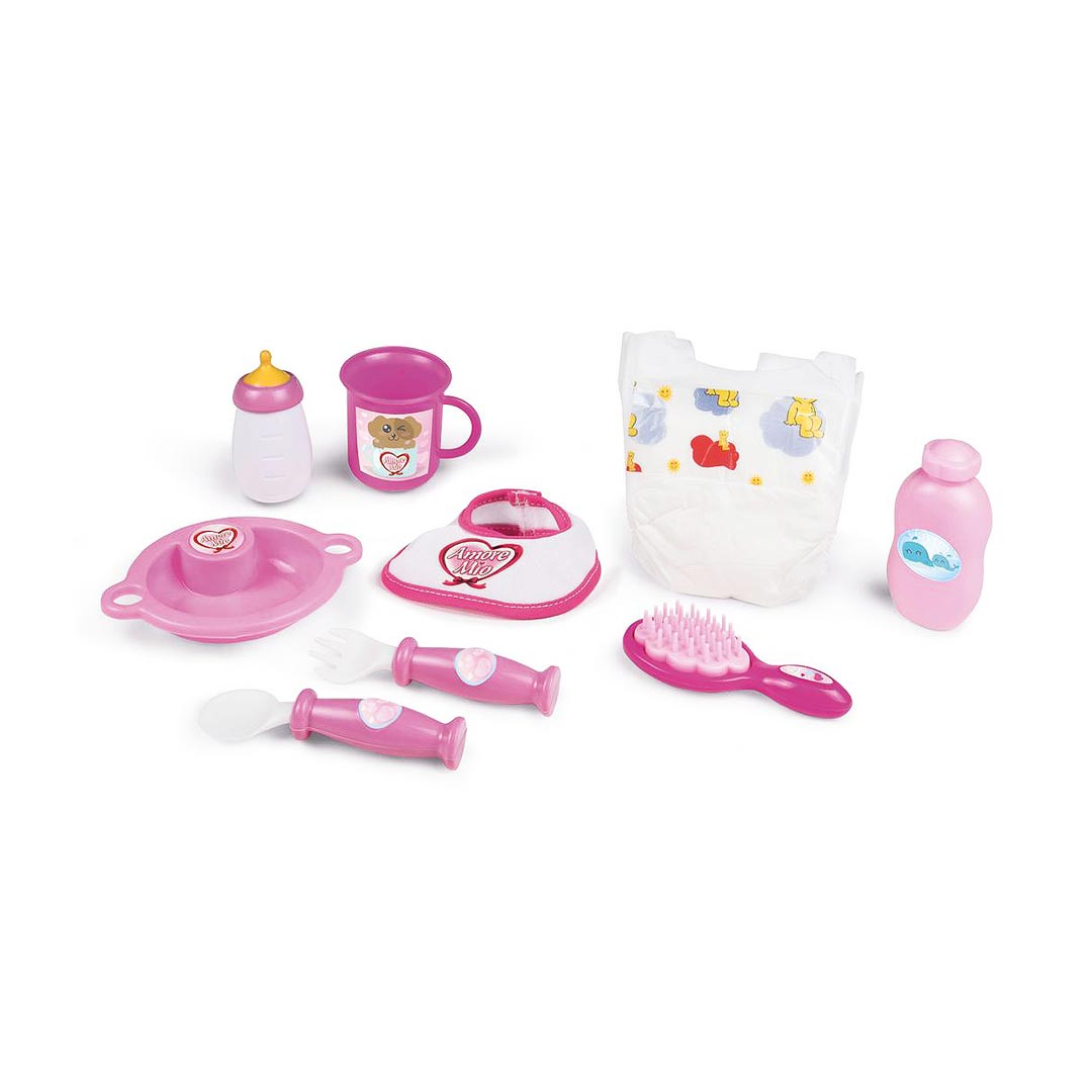Esclusivo set, adatto per le gite fuoriporta con la propria bambola! Set baby ha tutto quello che serve: borsetta a pois, bavaglia, biberon, tazzina, piattino con cucchiaio e forchetta, spazzola, sapone lavamani e persino un pannolino.