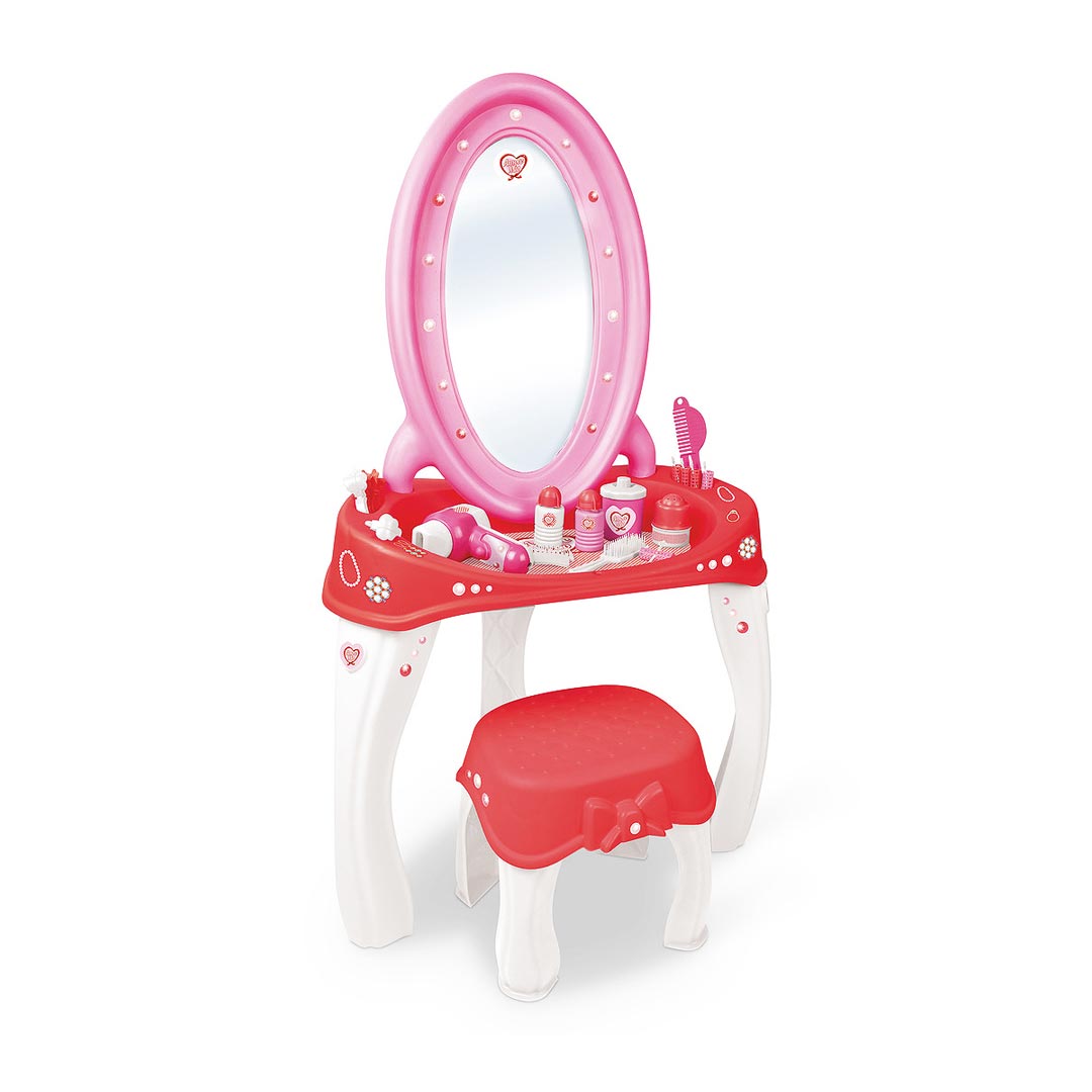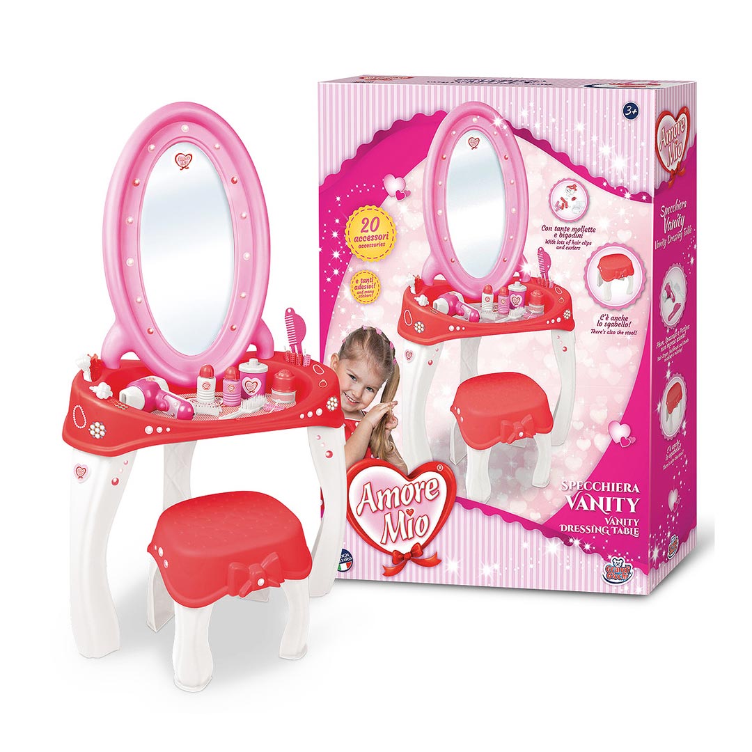 Sedute sul loro comodo seggiolino, le bambine potranno sistemarsi i capelli, truccarsi, indossare i gioielli e divertirsi con i 20 accessori inclusi. La specchiera è alta ben 90 cm; incluso nella confezione il pratico e comodo sgabello.