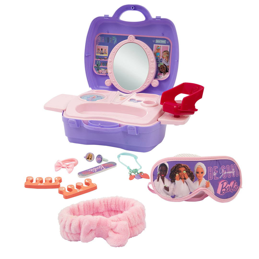 È il momento di farsi belle con Barbie! La valigetta include: 1 limetta per unghie, 1 foglio adesivi per decorare le unghie, 2 separatori dita dei piedi, 1 braccialetto con 3 charms, 1 fascetta per capelli per bambina, 1 fascetta per capelli per Barbie, 1 mascherina e 2 anellini. Barbie non inclusa.