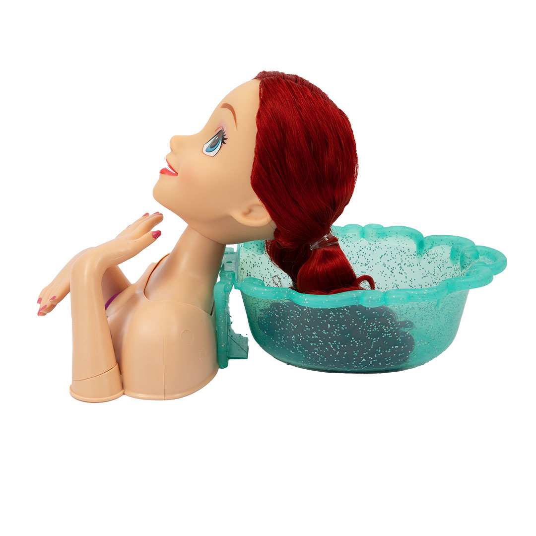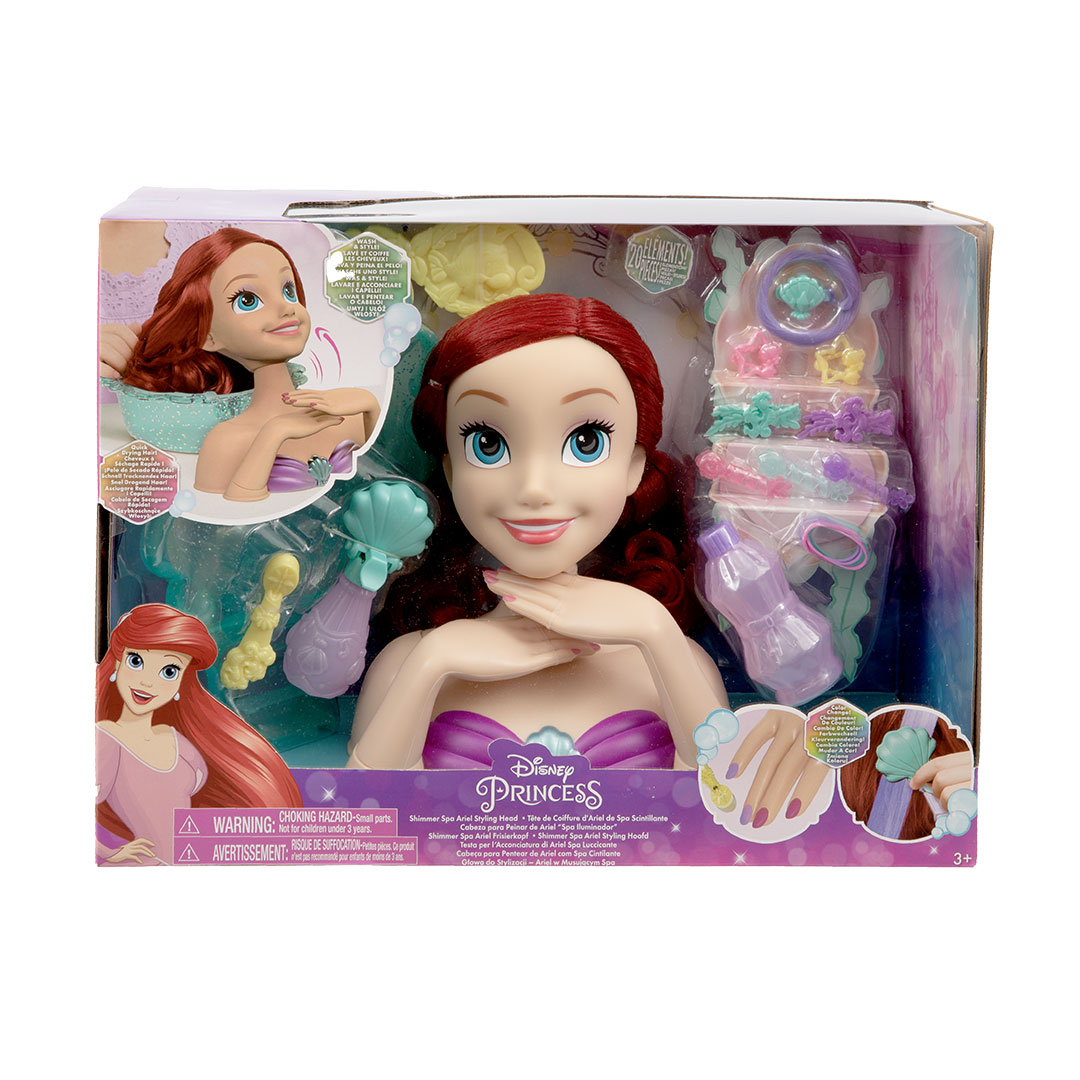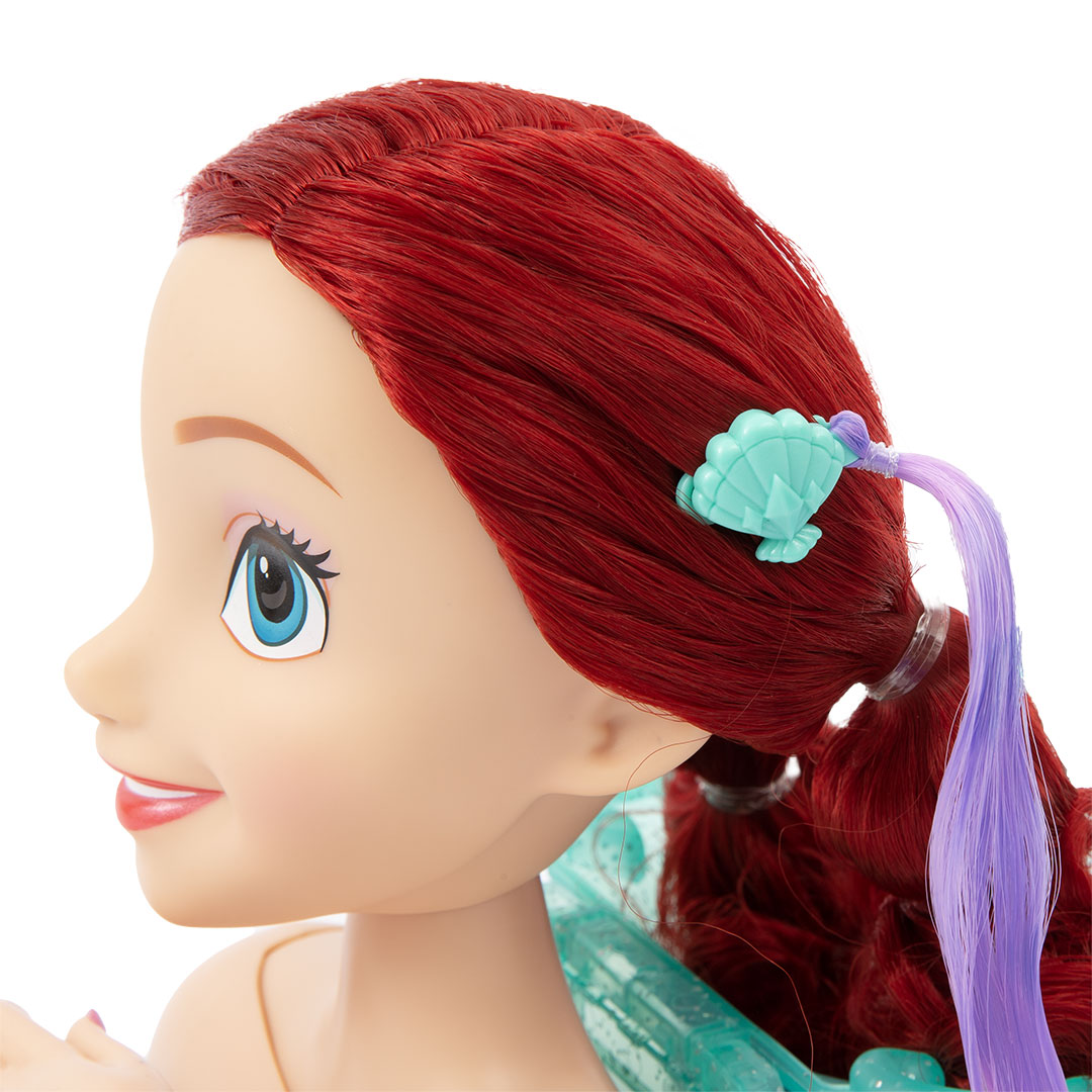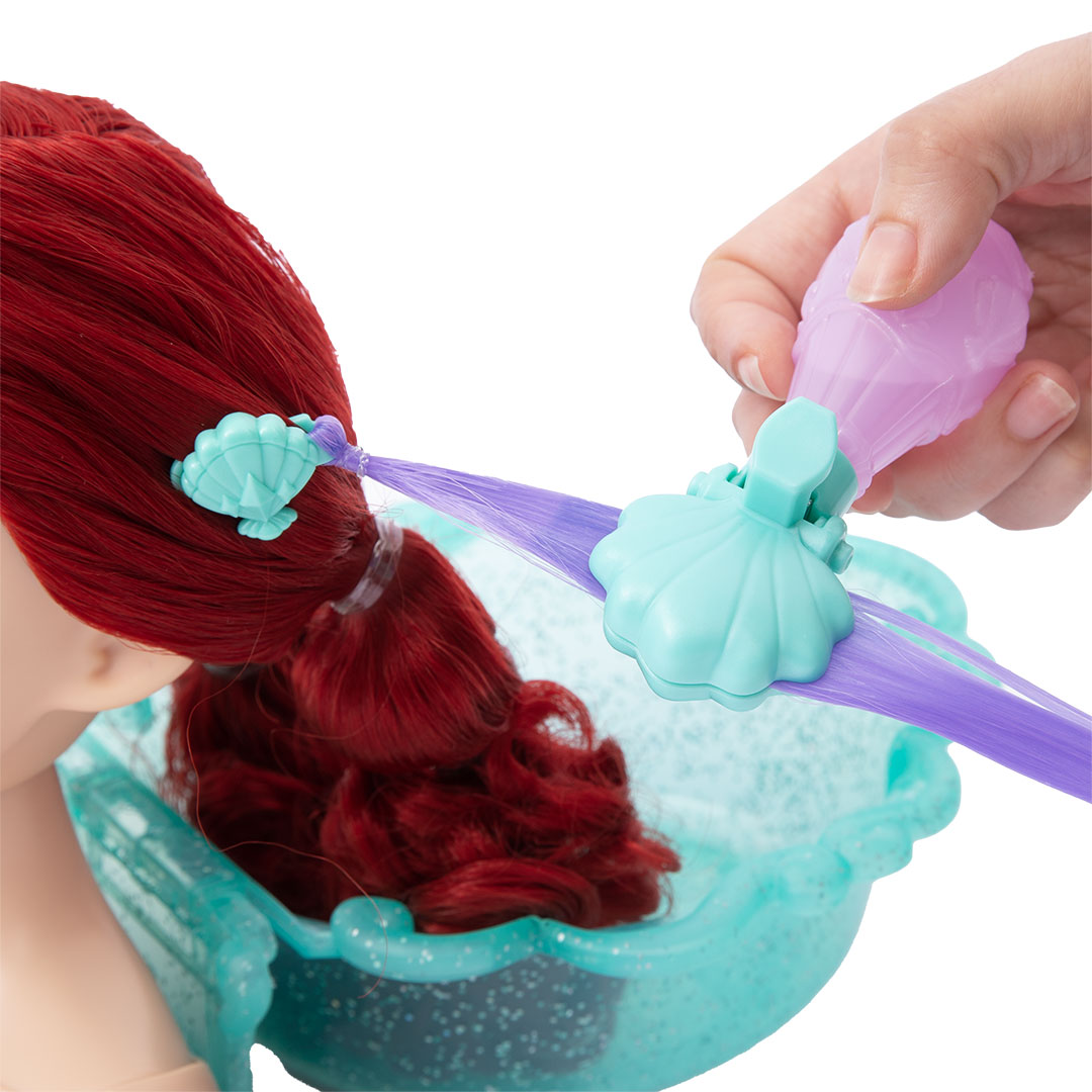 Testa di Ariel da 20 cm con collo articolato e 20 accessori per creare infinite acconciature e un look sempre alla moda! Inclusa anche 1 vaschetta per divertirsi a lavare i suoi capelli. Unghie ed extension cambiano colore!