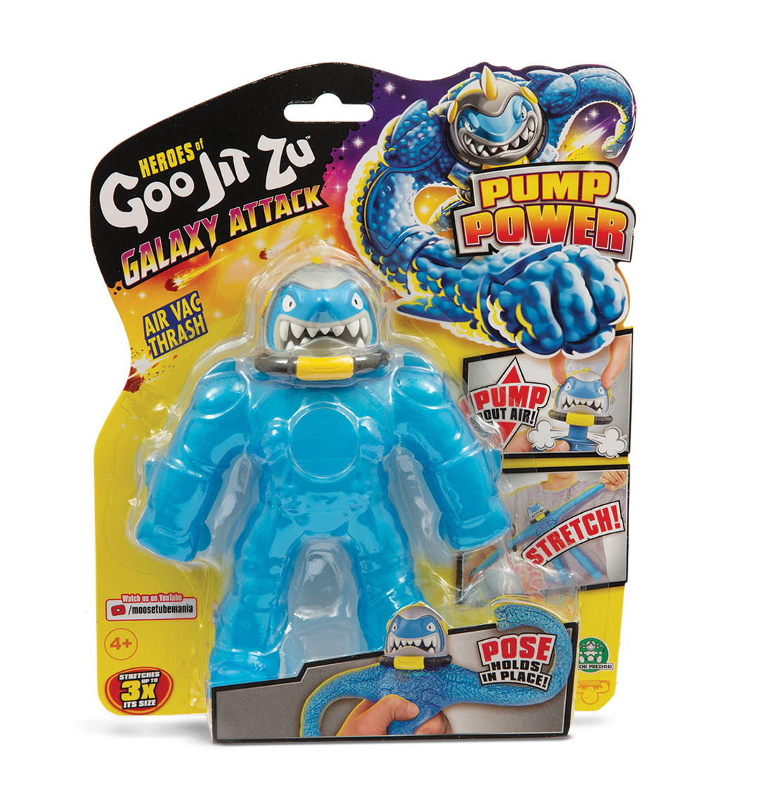 Personaggi Goo Jit Zu grandi in versione Galaxy Attack, da schiacciare e allungare, con funzione PUMP POWER: pompa, tira, in posa e rilascia. Assortimento 2 modelli: Air Vac Orbitox e Air Vac Thrash. Altezza 17 cm.