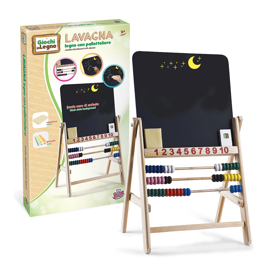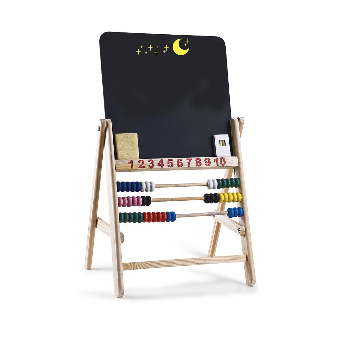 Una splendida lavagna in legno perfetta per disegnare con i gessetti! Un ottimo strumento per imparare a scrivere i numeri e a contare grazie al pallottoliere posto sotto di essa. Inclusi cancellino e gessetti colorati!