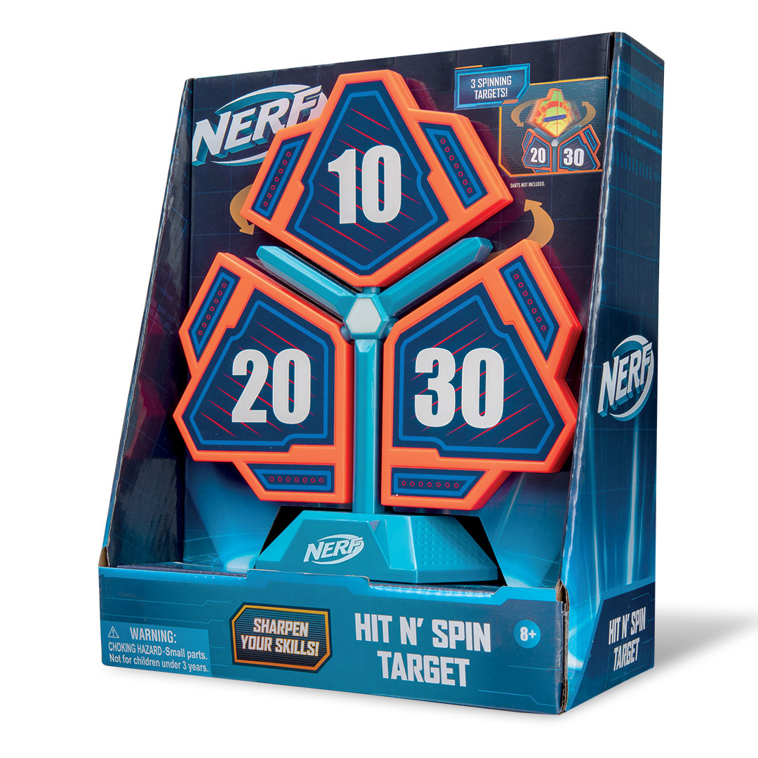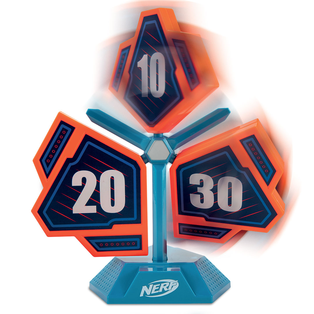 Bersaglio Nerf con 3 pannelli rotanti. Si illumina al buio. Può essere usato in casa o all’aperto.