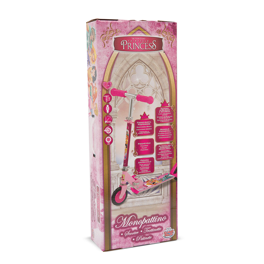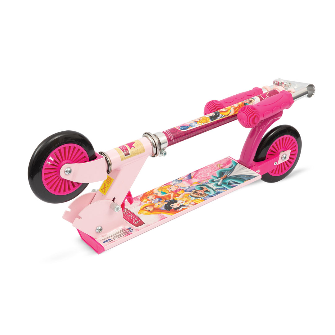 Monopattino in alluminio delle Princess. Pieghevole, altezza del manubrio regolabile, con sistema di blocco e sicurezza. Pedana antiscivolo e il freno sulla ruota posteriore. Con 3 altezze regolabili: 69/73/77 cm. Peso massimo consentito: 50kg